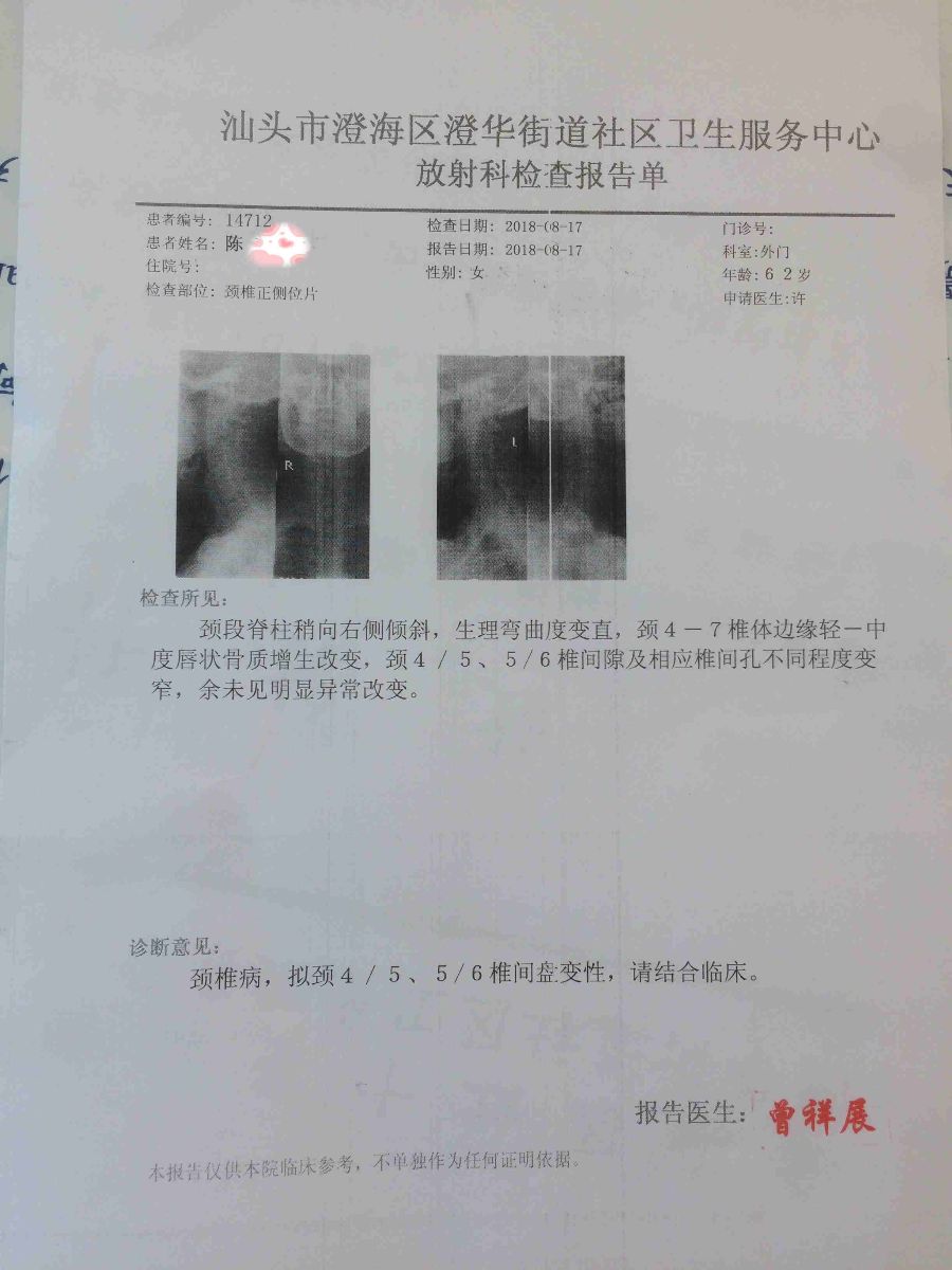 辅助检查:X光示C4~5,C5~6椎间隙及相应椎间孔不同程度变窄。