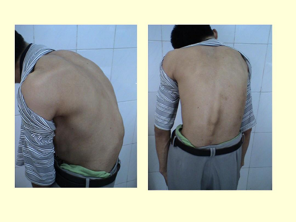 (3)胸椎病变: 胸椎受累时,表现为背痛、前胸和侧胸痛,最常见为驼背畸形。如肋椎关节、胸骨柄体关节、胸锁关节及肋软骨间关节受累时,则呈束带状胸痛,胸廓扩张受限,吸气咳嗽或打喷嚏时胸痛加重。严重者胸廓保持在呼气状态,胸廓扩张度较正常人降低50%以上,因此只能靠腹式呼吸辅助。由于胸腹腔容量缩小,造成心肺功能和消化功能障碍。