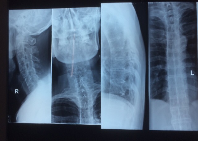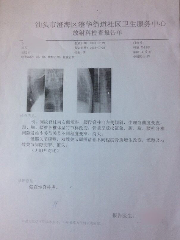辅助检查:颈、胸段脊柱向右侧倾斜,腰段脊在向左倒倾斜,生理弯曲度变直、颈、胸、腰椎各椎体呈竹节样改变,骨质呈疏松征象,颈、胸、腰椎各椎间隙及椎小关节 关节不同程度变窄、消失。骶髂关节模糊,双髋关节关节周围诸骨不同程度骨质增生改变,骶髂及双髋关节间隙变窄、消失。